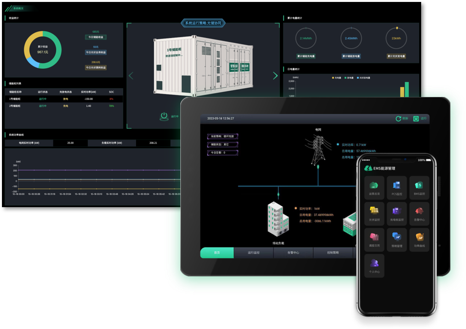 EMS系统从整个场站的视角展示源网荷储能量流转的实时情况,并聚合统计电网、负载、储能、光伏以及充电桩等节点的实时功率和电量数据。该系统还支持显示当前场站的运行策略、储能电池的状态以及系统的一次接线图等信息。
