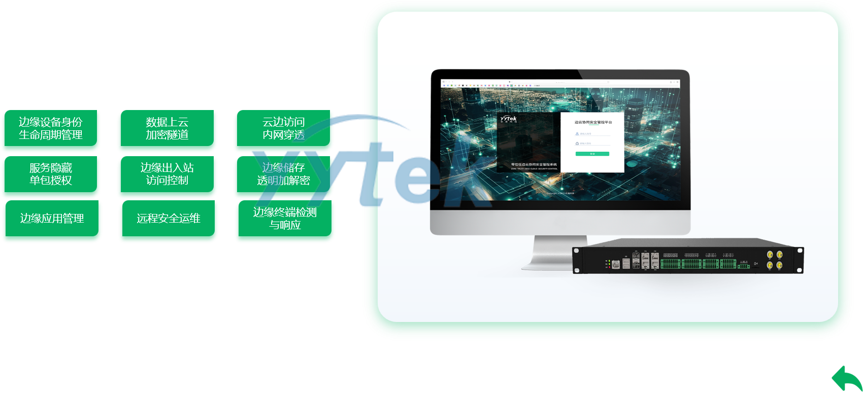 系统基于零信任理念,采用SDP软件定义边界网络安全架构,为基于云、边、端三级分层模型的物联网系统,提供增强身份认证和授权、设备接入安全、网络访问与传输安全、数据存储安全、安全应用仓库、安全运维等多维度防护。