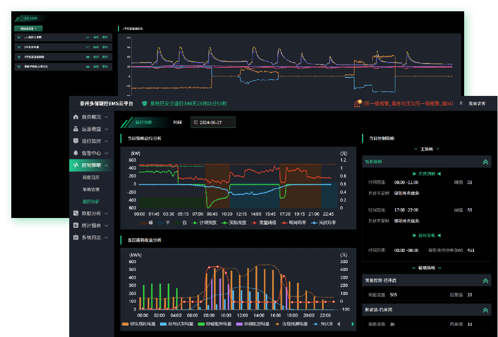 EMS系统支持全面的场站能源控制策略,包括并网待机、循环充放、削峰填谷、光储协同、离网备电、自定义策略、防逆流、防孤岛运行、以及需量控制等。场站可以根据自身需求、当地电价策略以及实际生产用电情况,按天设置相应的控制策略。同时,系统支持连接bet365VPP运营管理系统,接收虚拟电厂平台下发的需求响应策略并执行。