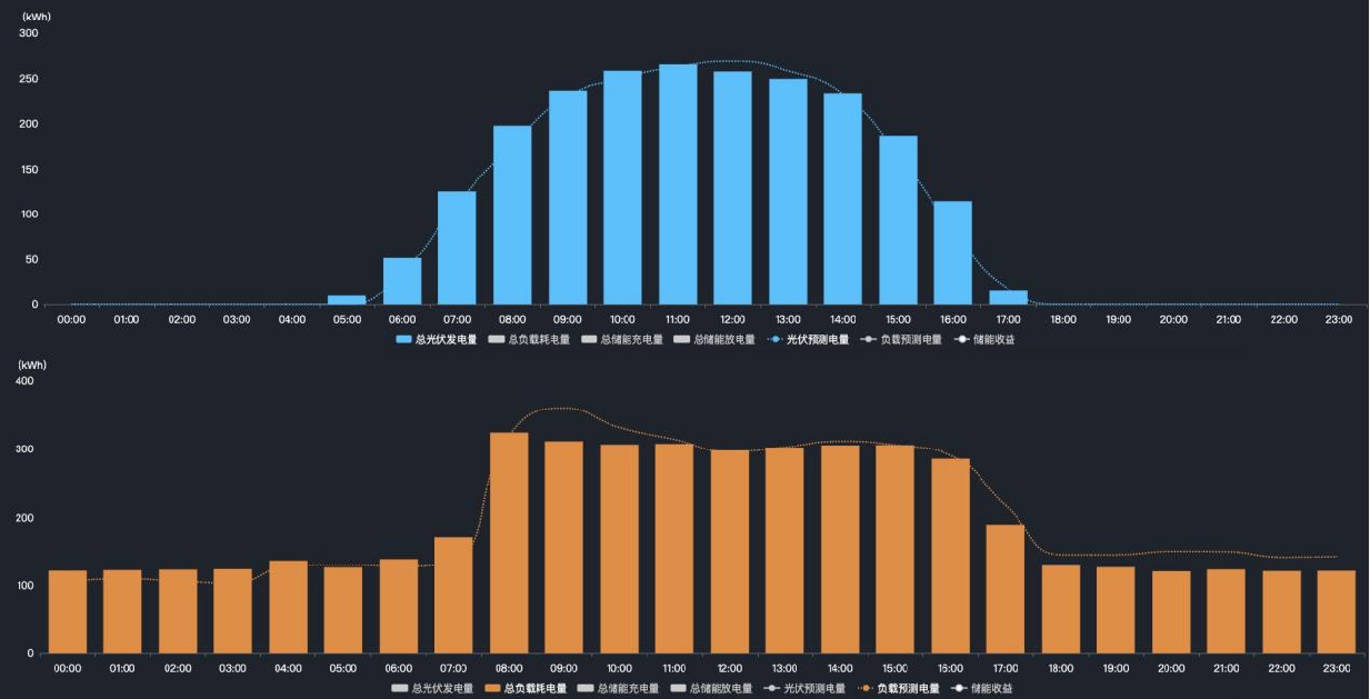 通过开展基于时间卷积神经网络(TCN)结合长度记忆时间网络(LSTM)的光伏发电出力和负载曲线预测方法等研究,实现提前预测光伏的发电量和负载曲线,从而根据储能的配储容量,结合不同时段的电价来自动动态制定系统充放电策略,保证经济效益的最大化。光伏预测平均准确率≥80%,负载预测平均准确率≥90%,光伏预测最小周期24小时。