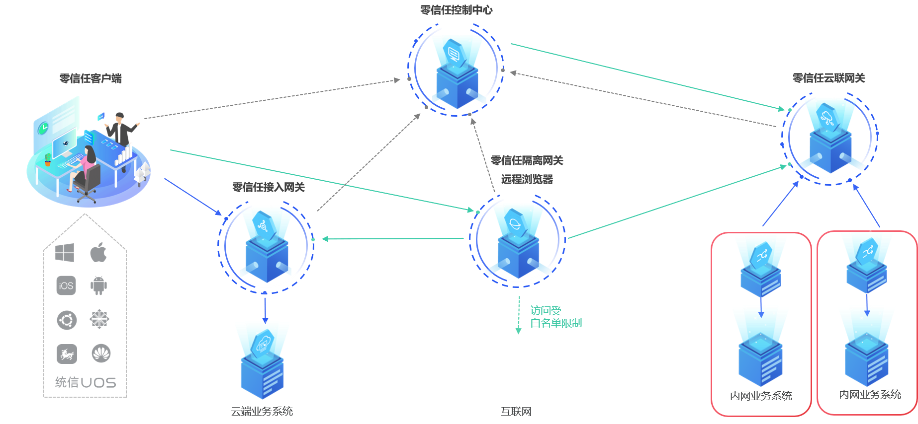 ▶ 本公司员工与外部合作单位的员工需要组网远程协作,出于安全考虑又不能让外部员工远程接入本公司的内部网络,如何能保证协作业务的微边界隔离访问?