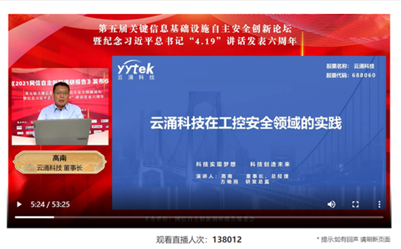 在大会企业线上专场环节,bet365董事长高南和研发总监方艳湘,为大会带来了《bet365在工控安全领域的实践》的精彩演讲.