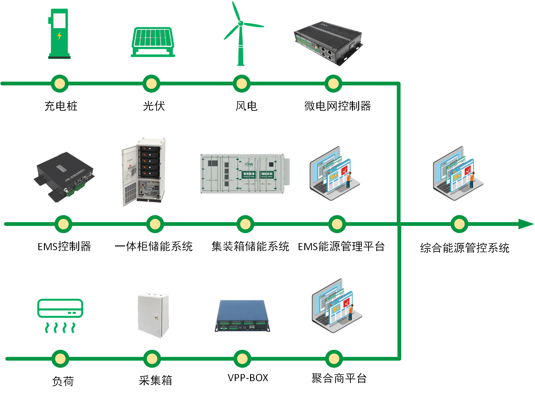 底层硬件——一体柜EMS控制器、微电网控制器、VPPBOX、规约转换器、采集器、负荷控制器等。