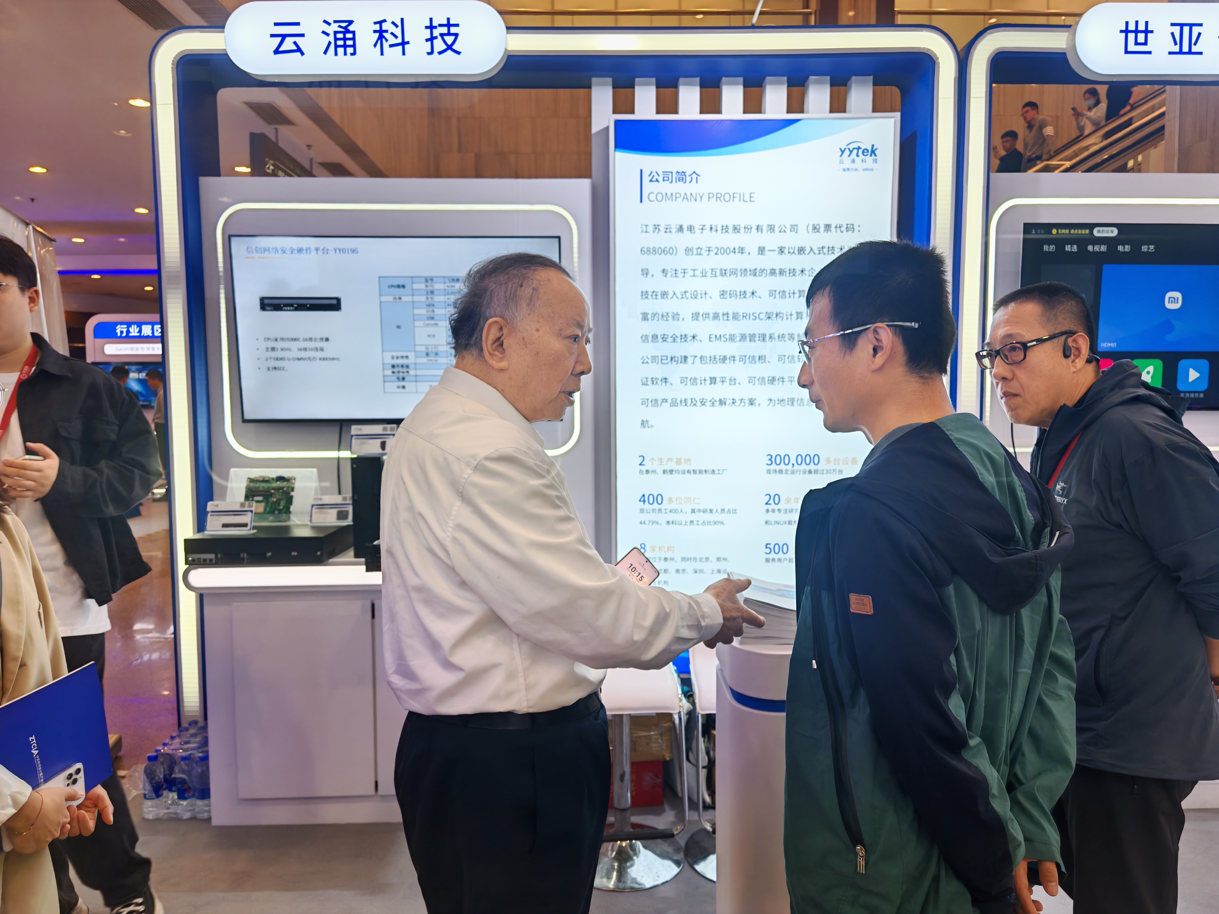 在展会现场,bet365中文官网展台集中展示了覆盖 “硬件可信根 - 可信平台 - 行业应用” 的全链条硬件产品体系。核心展品包括具备密钥生成与身份认证功能的可信模块、支持多系统架构的PCIe 可信卡,以及基于飞腾、龙芯等国产芯片打造的系列终端与服务器产品 —— 从适配轻量化场景的飞腾 E2000Q 瘦终端,到满足高密度计算需求的飞腾 S5000C-64 可信服务器,再到面向网安领域的飞腾 S5000C-16 可信硬件平台,为地理信息技术创新提供安全可靠的硬件支撑。其中,基于飞腾 D3000 的 PC 主机及主板、龙芯 3A6000 系列主板等产品,通过可信技术,实现 “计算 + 保护” 双体系结构的主动免疫防护,可有效抵御未知恶意攻击,完美契合大会 “地理可信空间建设” 核心议题。