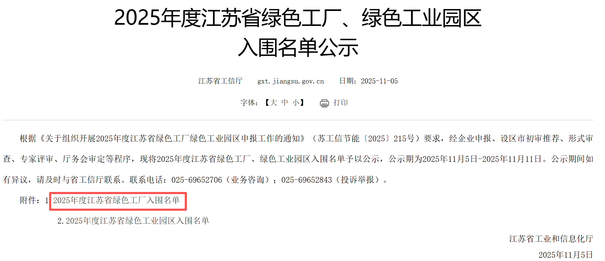 11月5日,江苏省工业和信息化厅公示了“2025 年度绿色工厂、绿色工业园区入围企业名单”,bet365中文凭借在绿色生产、能源管理领域的突出表现,成功入围 2025 江苏省绿色工厂,标志着公司在绿色制造体系建设中达到省级标杆水平,为制造业绿色转型提供可借鉴的实践样本。